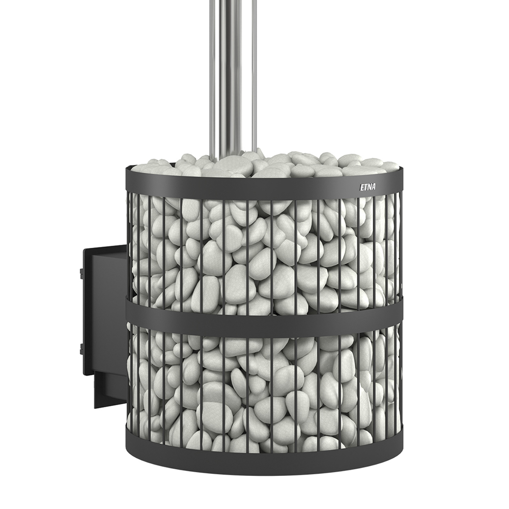Для устройства наружной открытой каменки печь ЭТНА 24 оснащается металлическим кожухом с прорезным рисунком оригинального дизайна. Пространство между печью и кожухом из двухмиллиметровой стали заполняется камнями для бани, которые выполняют роль теплонакопителя, перераспределяют тепло от стенок топки и защищают парящихся от жёсткого инфракрасного излучения. Воду подают на нагретые камни, с которых полученный пар распространяется по всему объёму парной. Кожух диаметром 560 миллиметров вмещает в себя до 150 килограммов камней крупной и средней фракции.